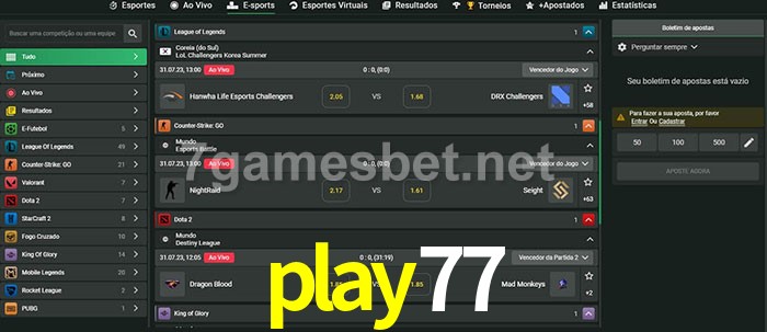 O play77 oferece uma grande seleção de opções de apostas em e-sports com probabilidades competitivas